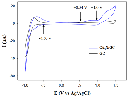 Figure. CV of the Cu3N nanocubes in acetonitrile with 0.1 M tetrabutylammonium perchlorate. Scan rate 0.1V/s[J. Am. Chem. Soc. 2011, 133, 15236–15239]