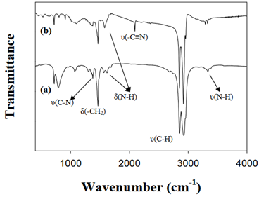 Figure. FT-IR spectra of (a) 1-octadecylamine and (b) as-prepared Cu3N nanocubes [J. Am. Chem. Soc. 2011, 133, 15236–15239]