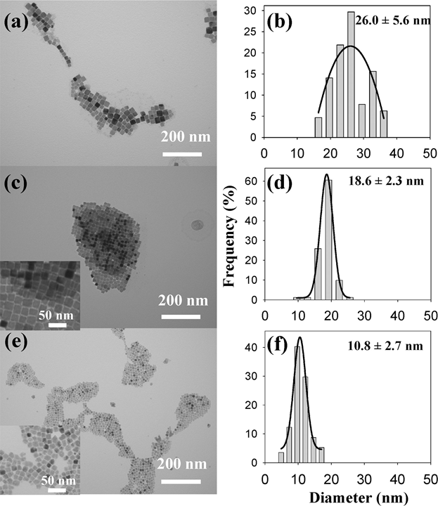 Figure. TEM images and the corresponding crystal size histograms of Cu3N nanocrystals synthesized with different organic solvents: (a,b) octadecylamine and octadecene, (c,d) hexadecylamine and octadecene,and (e,f) oleylamine and octadecene[J. Am. Chem. Soc. 2011, 133, 15236–15239]