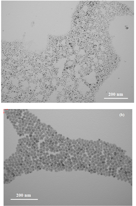 Figure. (top) TEM image of the as-prepared Cu3N nanoparticles with pure oleylamine as capping agent. (bot) TEM images of Cu3N nanoparticles synthesized in oleylamine and octadecene. The nanoparticles were obtained by cooling the reaction solution suddenly from high temperature down to room temperature[J. Am. Chem. Soc. 2011, 133, 15236–15239]