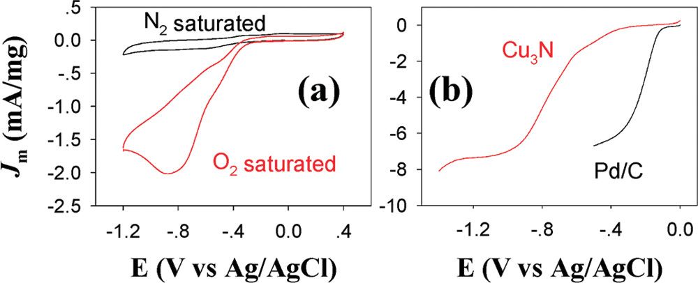 Figure. (a) CV of the Cu3N nanocubes in 0.1 M KOH solution. Scan rate 0.1V/s. (b) Rotating disk voltammograms in 0.1 M KOH solution saturated with oxygen (3025 rpm; scan rate, 5 mV s–1).[J. Am. Chem. Soc. 2011, 133, 15236–15239]