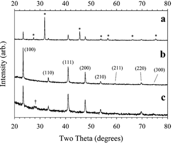 Fig. XRD pattern of the solvothermal decomposition products from the reaction of CuCl2 and NaN3 in toluene at 185 °C (a) as-synthesized [NaCl peaks *] and (b) after washing with methanol [cubic Cu3N peaks] and (c) a methanol-washed product from the reaction of CuCl2 and NaN3 in THF at 185 °C[Inorg. Chem. 2005, 44, 21, 7385–7393]