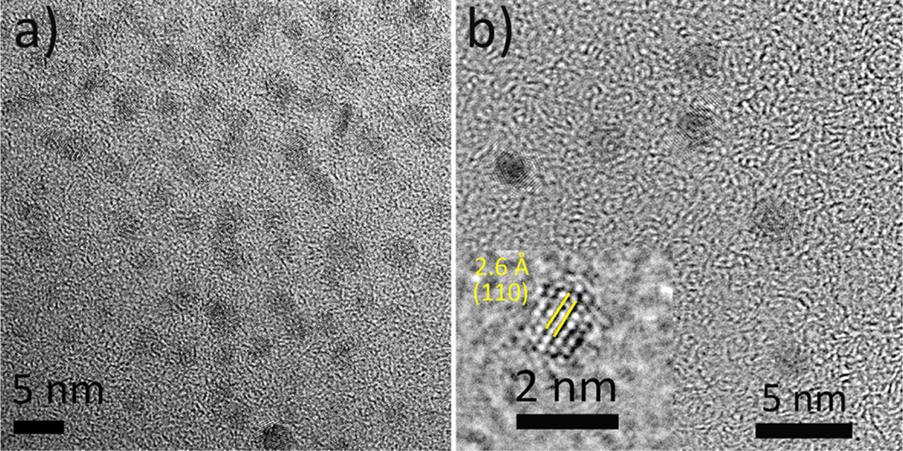 In a glovebox under argon atmosphere (O2 < 0.1 ppm and H2O < 0.1 ppm), 50 mg of Cu(OMe)2 was added into a 10 mL glass vial. Afterward 5 mL benzylamine was added and the vessel was sealed with a Teflon cap and taken out of the glovebox. The reaction vessel was transferred into a preheated oil bath set at 140 °C and held at that temperature for 15 min under vigorous magnetic stirring. During heating, after about 3 min, the color of the reaction solution changed from dark blue to red. Afterward, the reaction mixture was cooled down to room temperature. The product was precipitated by adding 40 mL of hexane and collected by centrifugation at 4000 rpm for 15 min. The product was washed two more times using 40 mL of hexane and finally dried under nitrogen flux. The yield of the reaction was >90% with respect to Cu(OMe)2. To obtain stable colloidal dispersions of Cu3N nanoparticles, the wet products obtained after washing were directly dispersed in chloroform, THF, and NMP using ultrasonication for 10 min. The nanoparticle dispersion in chloroform was used for TEM sample preparation.