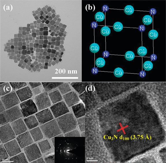 In a typical synthesis of Cu3 N nanocubes, 0.06 g Cu (NO3 )2·3H2 O was dissolved in the mixture of 5 mL 1-octadecylamine and 5 mL 1-octadecene. The solution was degassed for at least 1 hr and then heated at 150 °C for more than 3 h under magnetic stirring. During the reaction, the color of the solution changed from blue to green, and finally to yellow. The solution temperature was then raised to 250 °C at a rate of approximately 5 °C/min and kept for 30 min. The product was collected by centrifugation, washed with alcohol several times and finally dispersed in chloroform.