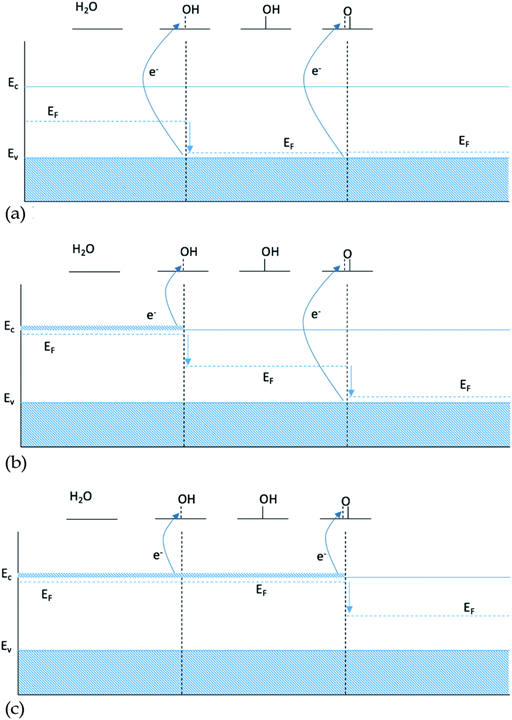 As only the first electron in the oxygen bond comes from the conduction band and the second from the valence band, the oxygen bond has a dependence of EO* = Ec + Ev, see Table 1. Since the position of the valence band of a given material does not change, when changing the type of dopant, Ev is kept constant and the oxygen bond, therefore, is affected by the changes in the dopant with the same strength as HO* and HOO*, giving a scaling factor of 1. This finite size effect is therefore also partly responsible for the large scatter of the O* binding, as some of the data include both doped and non-doped structures.