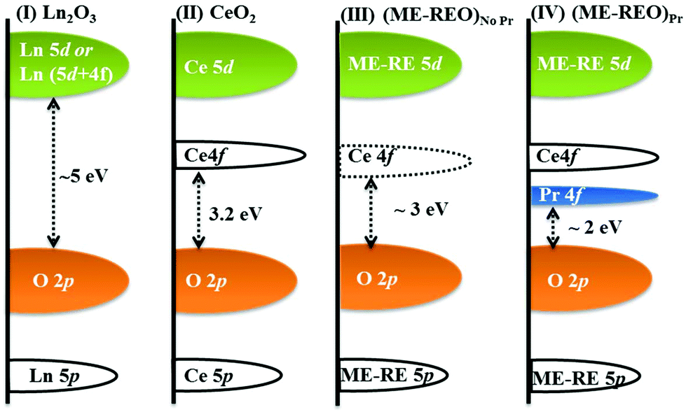 Figure 1. Schematic of the band structures of Ln2O3, where Ln = Gd3+, La3+, Sm3+, etc. (case I), CeO2 (case II), ME-REOs without Pr (case III) and ME-REOs with Pr (case IV), depicting the possible mechanism for band gap narrowing.[Dalton Trans., 2017,46, 12167-12176]