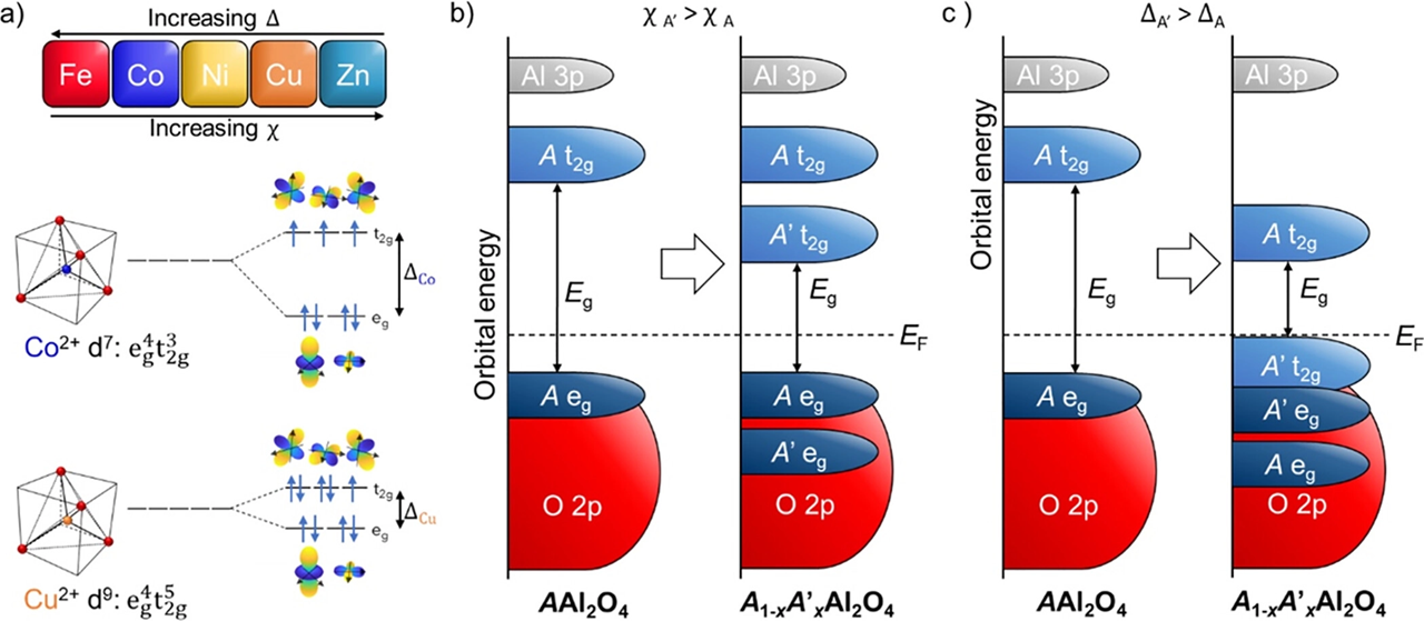 Figure 2. (a) Trends in crystal field splitting Δ and electronegativity χ for the five constituent metals of the high-entropy spinel. Crystal field splitting for tetrahedrally coordinated divalent Co and Cu. (b) The addition of a transition metal of greater electronegativity can reduce the band gap energy by introducing states between the eg and t2g states of the original transition metal. (c) The addition of a transition metal of lower crystal field splitting can reduce the band gap energy both by introducing new occupied t2g states above the eg states of the original transition metal and by lowering its unoccupied t2g states.[J. Am. Chem. Soc. 2023, 145, 6753−6761]