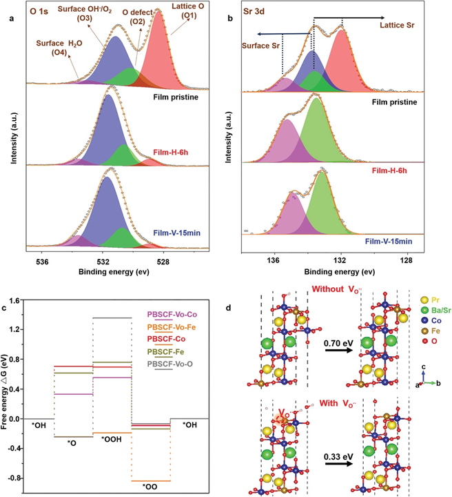 Figure 1. a,b) XPS spectra of a) O 1s, and b) Sr 3d of the pristine PBSCF film, Film-H-6h and Film-V-15 min. c) The computed Gibbs free energy diagram of the four-step 4e− OER mechanism on PBSCF slab with and without one surface vacancy. The adsorption sites investigated include the Co and Fe sites for PBSCF, the Co, Fe, and Vo sites for PBSCF with oxygen vacancy (PBSCF-Vo). d) Atomic structures of PBSCF slabs with adsorbates on the Co site with and without oxygen vacancy presented. The free energy changes of the *OH−*O step with and without induced defect are marked.