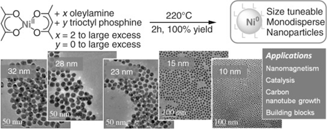 In a typical experiment, oleylamine (4 equiv, 3.12×10−3 mol, 834 mg) was introduced in a Schlenk tube and degassed under vacuum. [Ni(acac)2] (1 equiv, 7.8×10−4 mol, 200 mg) was then added to the oleylamine. The mixture was heated to the desired temperature by using an oil bath. As 215 °C, the solution turned black. After 10 min to 2 h of heating, the solution was cooled. The nanoparticles were collected by centrifugation, and the supernatant was stored for further analysis. The reaction was conducted similarly by using [Pd(acac)2]. Oleylamine (4 equiv, 3.12×10−3 mol, 834 mg) was introduced into a Schlenk tube and degassed under vacuum. [Pd(acac)2] (1 equiv, 7.8×10−4 mol, 237 mg) was then added to the oleylamine. The mixture was heated to the desired temperature by using an oil bath. As 180 °C, the solution turned black. After 10 min of heating, the solution was cooled.