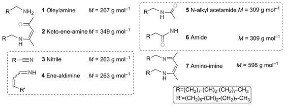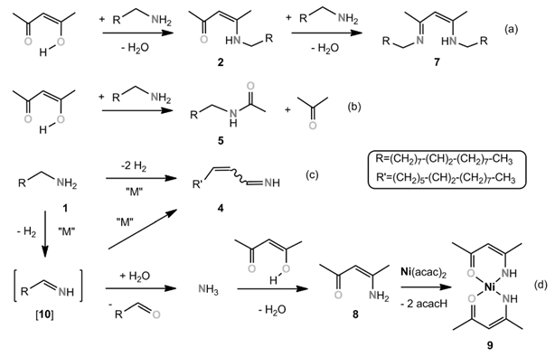 At this point, a radical pathway could be definitively excluded for two reasons: 1) radical formation by oxidation of amines has been reported in the literature, but only in the presence of a strong oxidizing agent, generated NiIII complexes.38 Indeed, the standard redox potential for the couple NR3+./NR3 is between 1.0 and 1.9 V, whereas the Ni(+2)/Ni one is only −0.26 V.39 Even taking into consideration the variation from standard potentials under the present conditions, NiII is clearly not a strong enough oxidizing agent to oxidize the oleylamine through a radical pathway; and 2) experimentally, if ever the RNH2+. radical were to form, it would mean that strong oxidizing conditions were encountered and the nitrile byproduct 3 should form in the medium, which was not the case.40 Moreover, the radical itself would break and/or dimerize and give corresponding byproducts in significant amounts, since 2 equiv of it would be formed during the reaction.