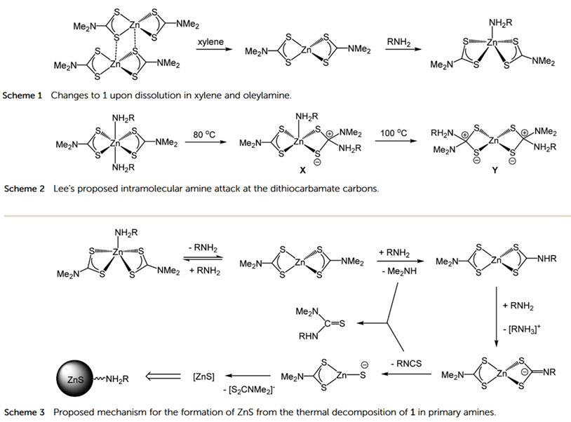 [Zn(S 2 CNi Bu2 ) 2 ] (5 mM) was added to oleylamine (20 mL) in a three-neck round bottom flask attached to a condenser and evacuated and refllled with nitrogen repeatedly for 15 minutes. The solution was heated to 230 C and held there for 1 h. The mixture was allowed to cool to room temperature slowly, where upon methanol (80 mL) was added with stirring. The mixture was centrifuged and then the solution decanted leaving behind the resultant nanoparticles.