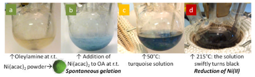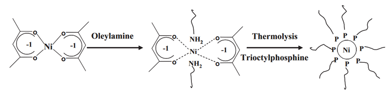 In a typical experiment, oleylamine (4 equiv, 3.12×10−3 mol, 834 mg) was introduced in a Schlenk tube and degassed under vacuum. [Ni(acac)2] (1 equiv, 7.8×10−4 mol, 200 mg) was then added to the oleylamine. The mixture was heated to the desired temperature by using an oil bath. As 215 °C, the solution turned black. After 10 min to 2 h of heating, the solution was cooled. The nanoparticles were collected by centrifugation, and the supernatant was stored for further analysis. The reaction was conducted similarly by using [Pd(acac)2]. Oleylamine (4 equiv, 3.12×10−3 mol, 834 mg) was introduced into a Schlenk tube and degassed under vacuum. [Pd(acac)2] (1 equiv, 7.8×10−4 mol, 237 mg) was then added to the oleylamine. The mixture was heated to the desired temperature by using an oil bath. As 180 °C, the solution turned black. After 10 min of heating, the solution was cooled.