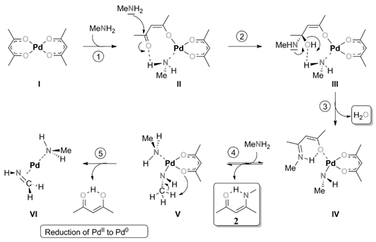 The reaction starts with the nucleophilic attack of benzylamine on one carbonyl center of the acetylacetonate (1). In contrast to the aminolysis, the C-C bond is not broken (2). The oxygen is released in the form of a hydroxyl group, (3*), concurrently leading to 4-benzylamino-3-penten-2-one.