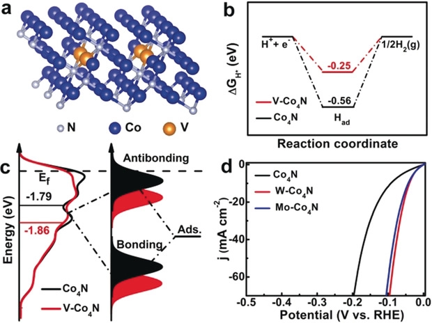 the electronic interaction could be considered as the coupling between the adsorbate valence states and the transition-metal d states, which gives rise to the formation of separated bonding and antibonding states. The bonding states are generally fully filled because they are far below the Fermi level (Ef), while the electron filling of the antibonding states depends on these energy states relative to the Fermi level and contributes to the bond strength. Since the antibonding states are always above the d states in terms of energy, the d band center model would be a good descriptor of the adsorbate–metal interaction. Impressively, the d-band center (Ed) of Co4N and V-Co4N relative to Ef are calculated to be −1.79 eV and −1.85 eV, respectively (Figure 4 c), which clearly illustrates that the d-band center is far away from the Fermi level after V doping. It also suggests the antibonding energy states are lowered and the interaction between the adsorbate and surface is weakened, which is in agreement with the UPS results, where the valence band is shifted away from the Fermi level after V doping. These studies provide the intrinsic elucidation that the downshift of the d-band center as the antibonding states are filled with more electrons after V doping decreases the adsorption energy of H and meanwhile facilitates the desorption of H from the catalyst surface for HER catalysis.