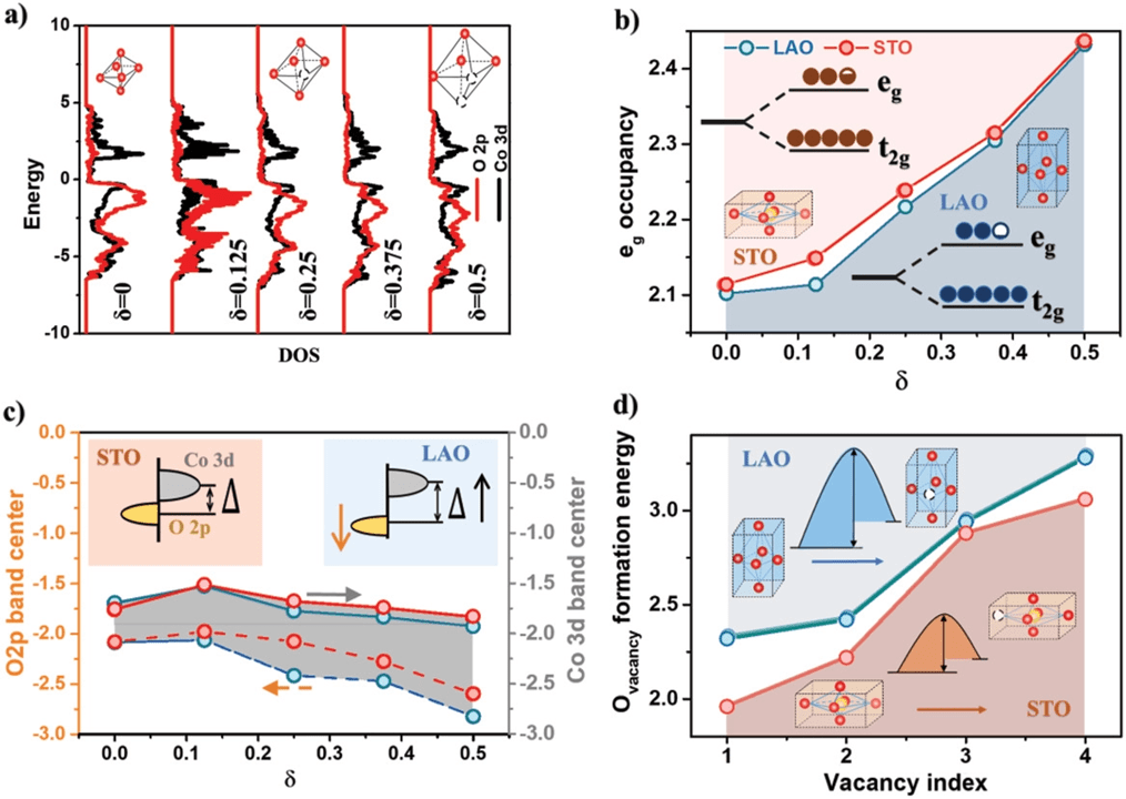 For both LSC films with tensile and compressive strain, our DFT results showed that the increase of δ lead to more electrons filled into the eg states (Figure 5b) and the increase of Δ value (Figure 5c). Such changes in electronic structure are likely to be the reason for the degraded OER activities for vacuum annealed LSC we observed in the electrochemical test.
